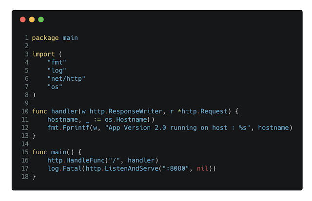 Let’s create a simple HTTP service which returns server hostname & current version of the binary (hardcoded). I’ve used go-lang for this, below is code snippet which returns hostname and service version.