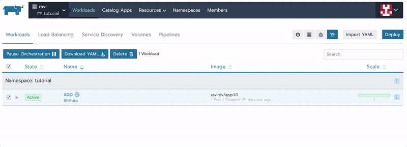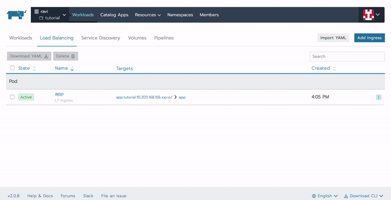 It will show the workload as active once the container is started. Now since our app is HTTP service running on port 8080, we need to expose this port to the external world. In order to do this, we got few options, first one is to bind container’s port 8080 to a random port on a node, another option is to attach an L7 load balancer to route traffic to our container. L7 Load balancer approach give you more flexibility. By default, Rancher deploys nginx to handle L7 traffic and it runs on port 80. Rancher also allows you to specify a hostname or generate a xip.io subdomain with your app name. In this case, it generated app.tutorial..xip.io and point its A record to out cluster IP.