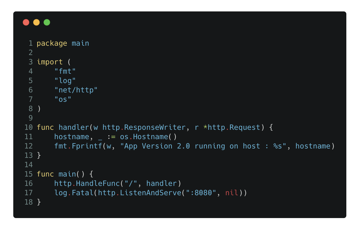 Let’s create a simple HTTP service which returns server hostname & current version of the binary (hardcoded). I’ve used go-lang for this, below is code snippet which returns hostname and service version.